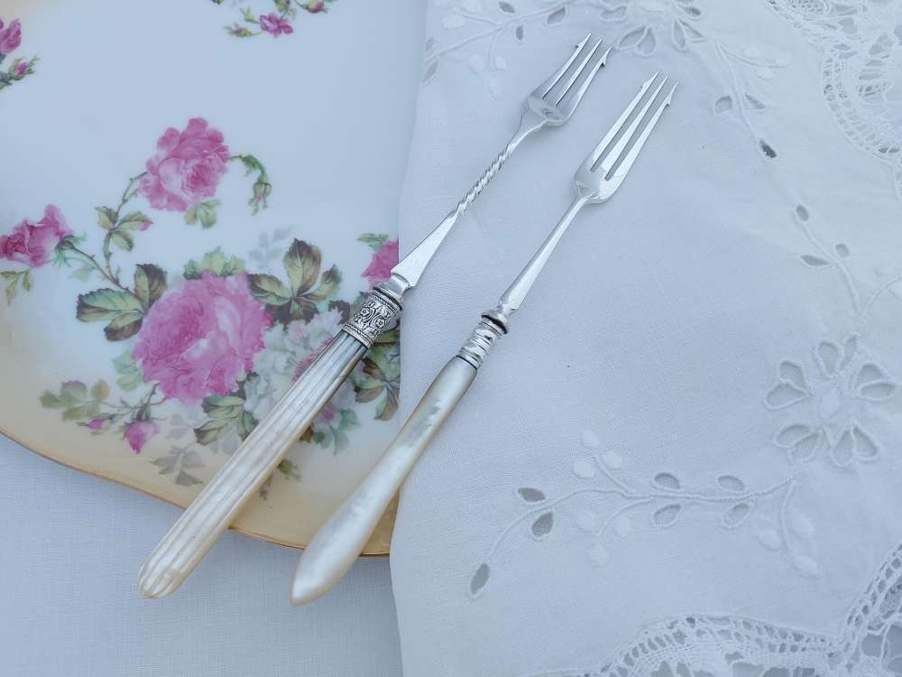 Zwei wunderschöne versilberte"Pickle Forks"mit Perlmuttgriffen.